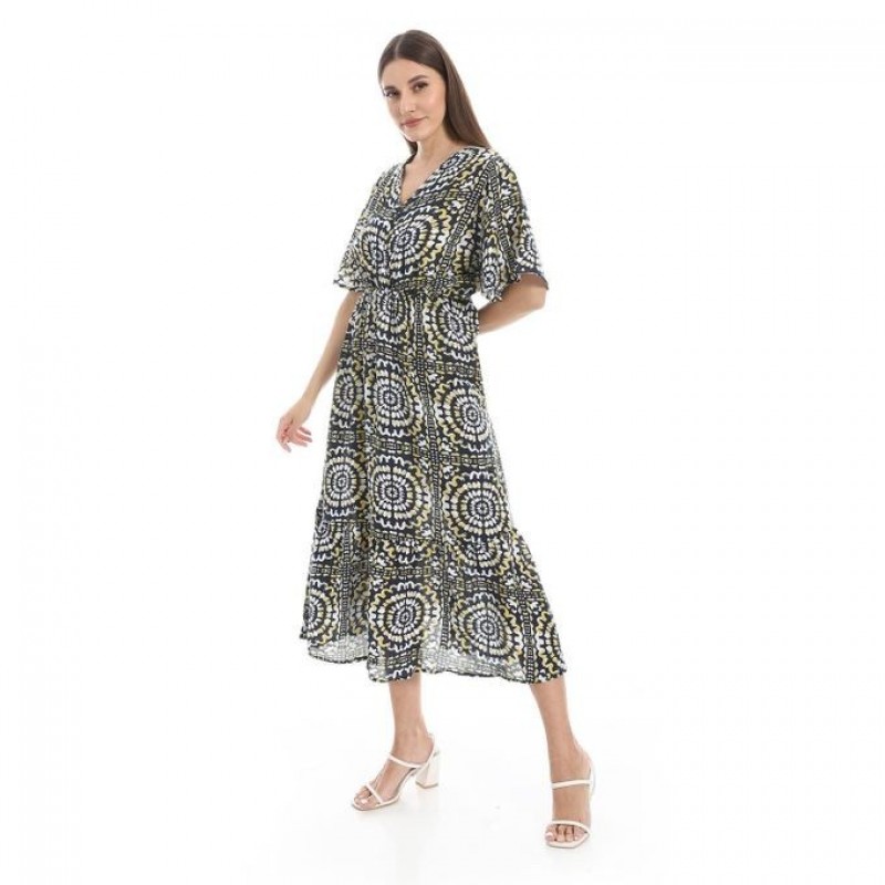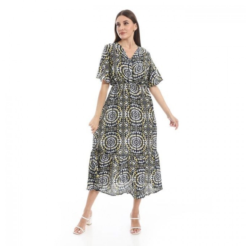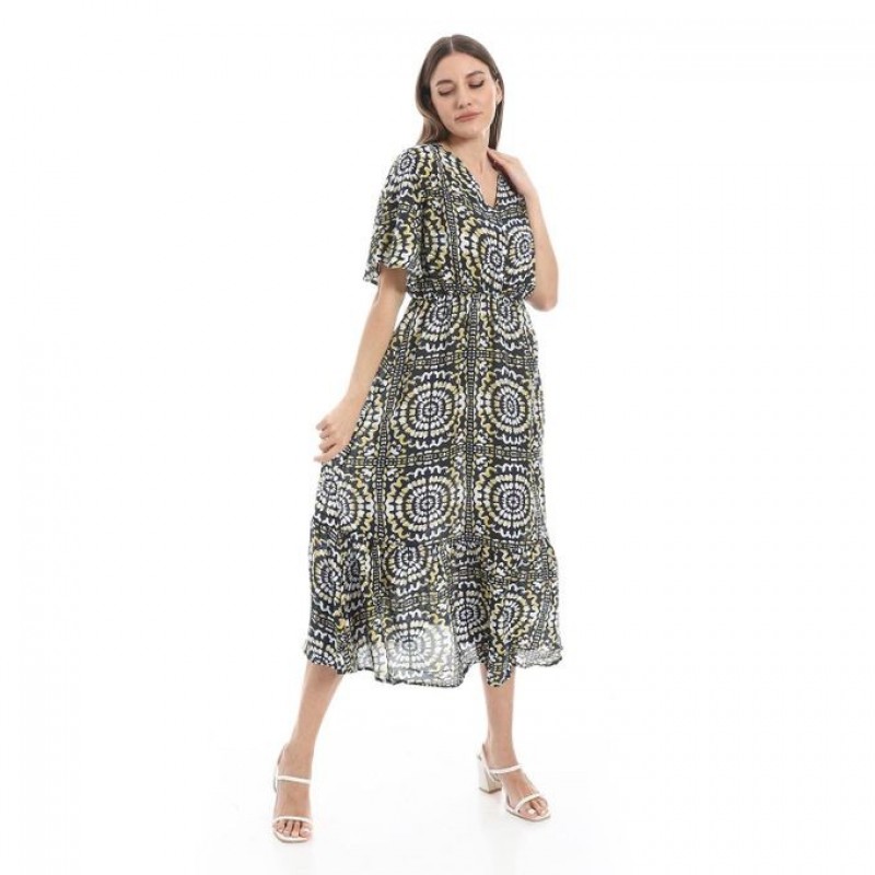 Andora Short Bell Sleeves V-Neck Dress - Navy Blue, White and Yellow دينار13.5 |