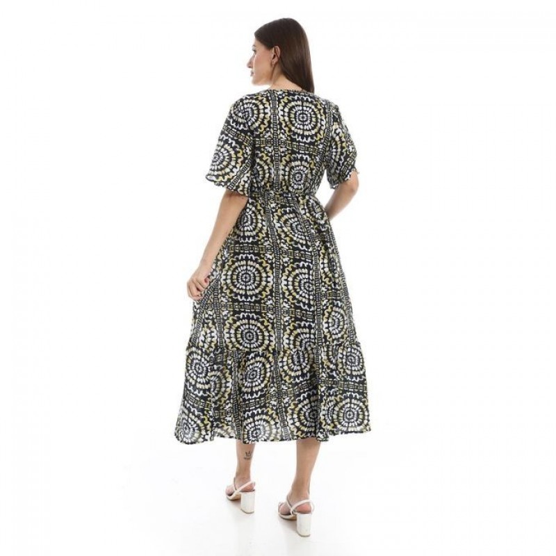 Andora Short Bell Sleeves V-Neck Dress - Navy Blue, White and Yellow