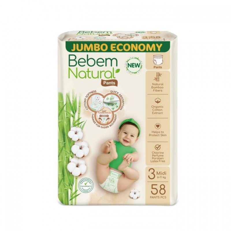 Bebem حفاضات ناتشورال بانتس من بيبيم، عبوة جامبو متوسطة الحجم من 3-58 قطعة