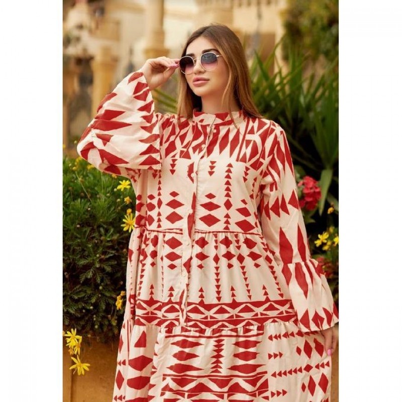 فستان حريمي مطبوع بتصميم أنيق بأكمام طويلة لون