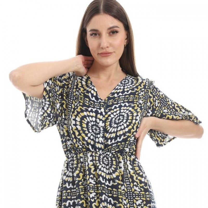 Andora Short Bell Sleeves V-Neck Dress - Navy Blue, White and Yellow